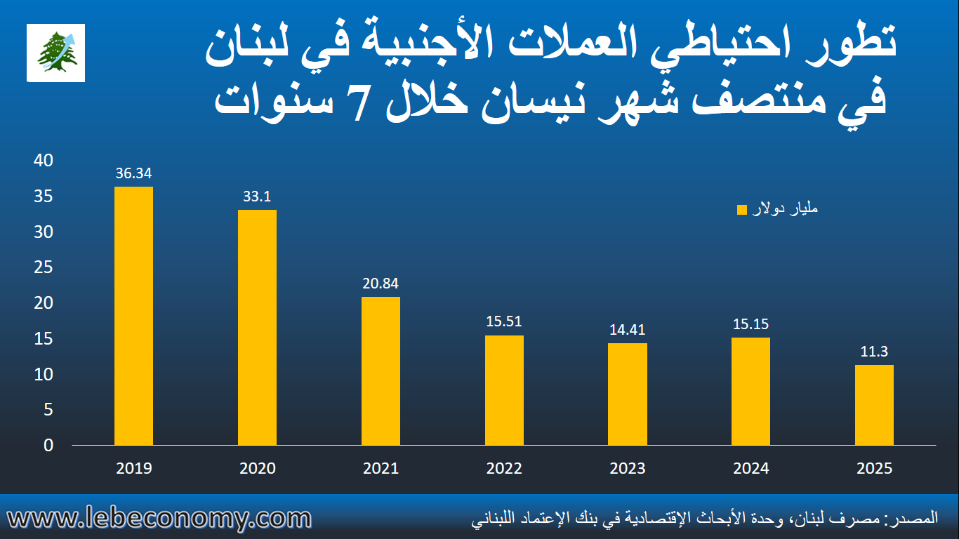 وفقاً لتقرير بنك الإعتماد اللبناني، حصل موقعنا Leb Economy على نسخة منه، أشار التقرير نصف الشهري الصادر عن مصرف لبنان إلى إرتفاع في موجوداته الخارجيّة بالعملات الأجنبيّة بمبلغٍ قدره 189.40 مليون د.أ. (1.70%) خلال النصف الأوّل من شهر حزيران 2025 إلى 11.30 مليار د.أ. (1،011.24 ترليون ل.ل.)، مقارنةً مع 11.11 مليار د.أ. (994.28 ترليون ل.ل.) قبل فترة أسبوعين. يجدر الذكر أنّ موجودات مصرف لبنان الخارجيّة بالعملات الأجنبيّة قد شهدت زيادة مضطردة خلال الفترة الممتدّة بين بداية شهر آب 2023 ومنتصف شهر حزيران 2025 بلغت قيمتها الإجماليّة حوالي 2.73 مليار د.أ. عقب سياسة مصرف لبنان النقديّة الجديدة القاضية بالإمتناع عن تسليف الحكومة ورفع الدعم عن معظم السلع والحدّ من طبع العملة المحليّة. من جهةٍ أخرى، تُبيِّن ميزانيّة مصرف لبنان زيادة بنسبة 3.91% (1.19 مليار د.أ.) في قيمة إحتياطاته من الذهب في النصف الأوّل من شهر حزيران 2025 إلى 31.58 مليار د.أ. (2،826.03 ترليون ل.ل.) في ظلّ إرتفاع أسعار الذهب عالميّاً بسبب المخاطر الجيوسياسيّة في منطقة الشرق الأوسط.