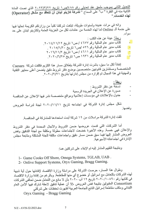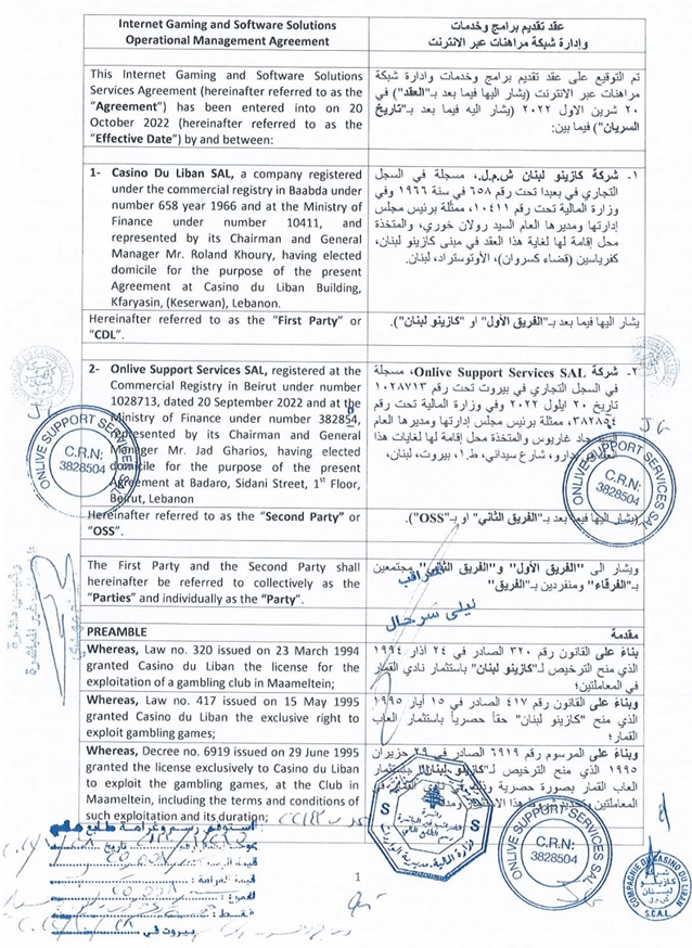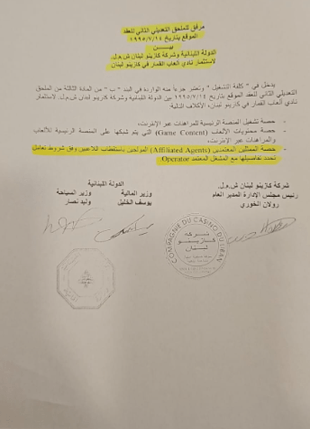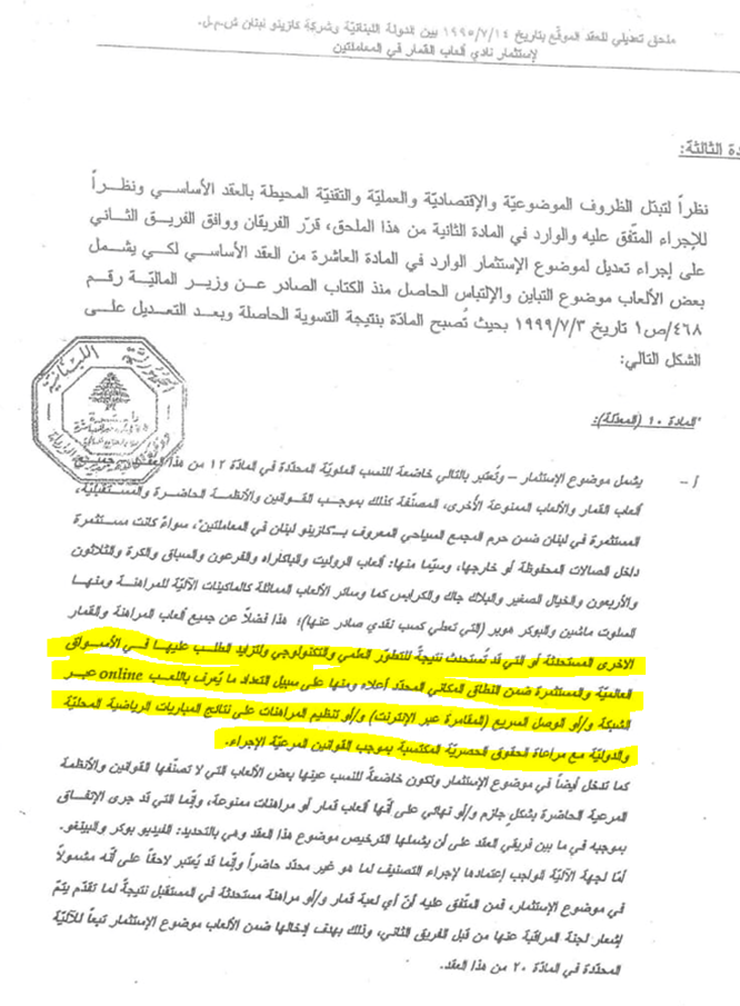 عام 2008 تمّ تعديل عقد الكازينو (الموقّع في الأصل في عام 1995) ليشمل الـ Online والـ Sports Betting بموافقة من مجلس الوزراء، وتمّ توقيع العقد من وزيرَي المال والسياحة في حينه (المستند رقم 2)، وذلك قبل تأسيسBetarabia وتقدّمها للمناقصة والفوز بها.