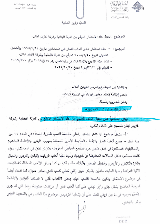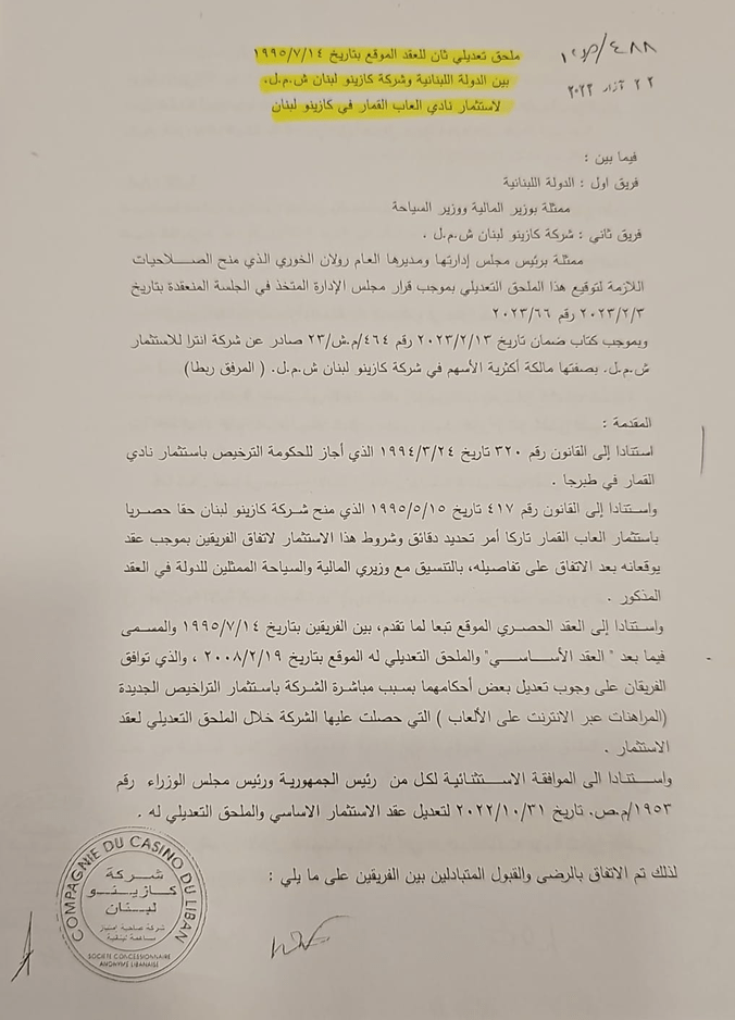 تمّ تعديل العقد بين الكازينو والدولة اللبنانية بعد الاستحصال على موافقة استثنائية من قبل كلّ من رئيس الجمهورية ورئيس مجلس الوزراء في 21/10/2022