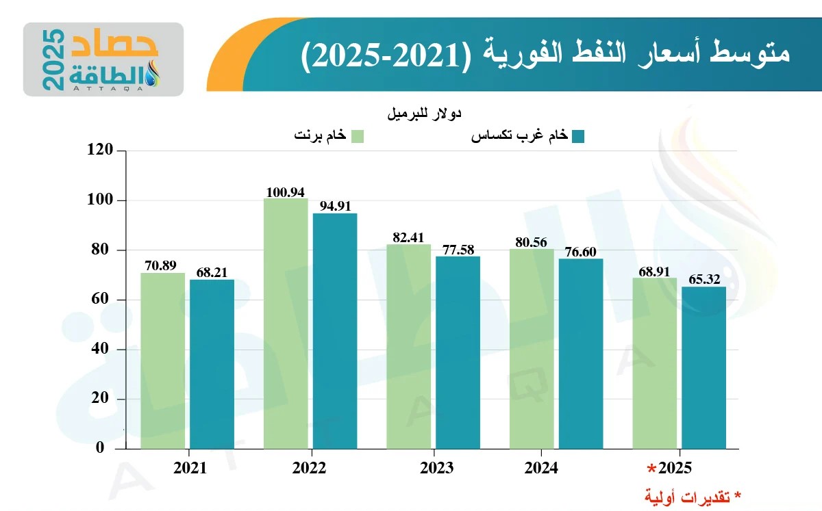 ويمثّل ذلك انخفاضًا بنسبة 9.6% في متوسط أسعار النفط -يشمل خامات برنت وغرب تكساس الوسيط ودبي-، مقارنة مع 68.92 دولارًا للبرميل خلال 2025.