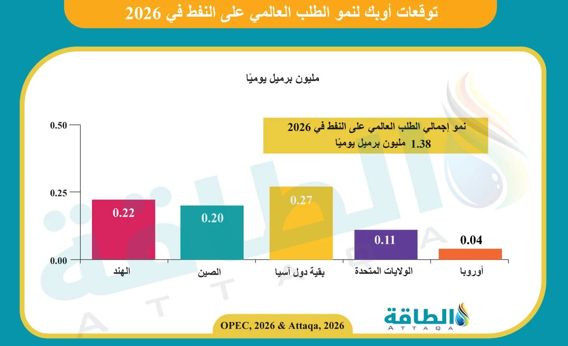 في المقابل تتوقع منظمة أوبك نموًا أعلى قليلًا عند 1.34 مليون برميل يوميًا خلال العام المقبل، انخفاضًا من المعدل المتوقع لعام 2026 عند 1.38 مليونًا، بقيادة الهند والصين، كما يوضح الرسم أدناه: