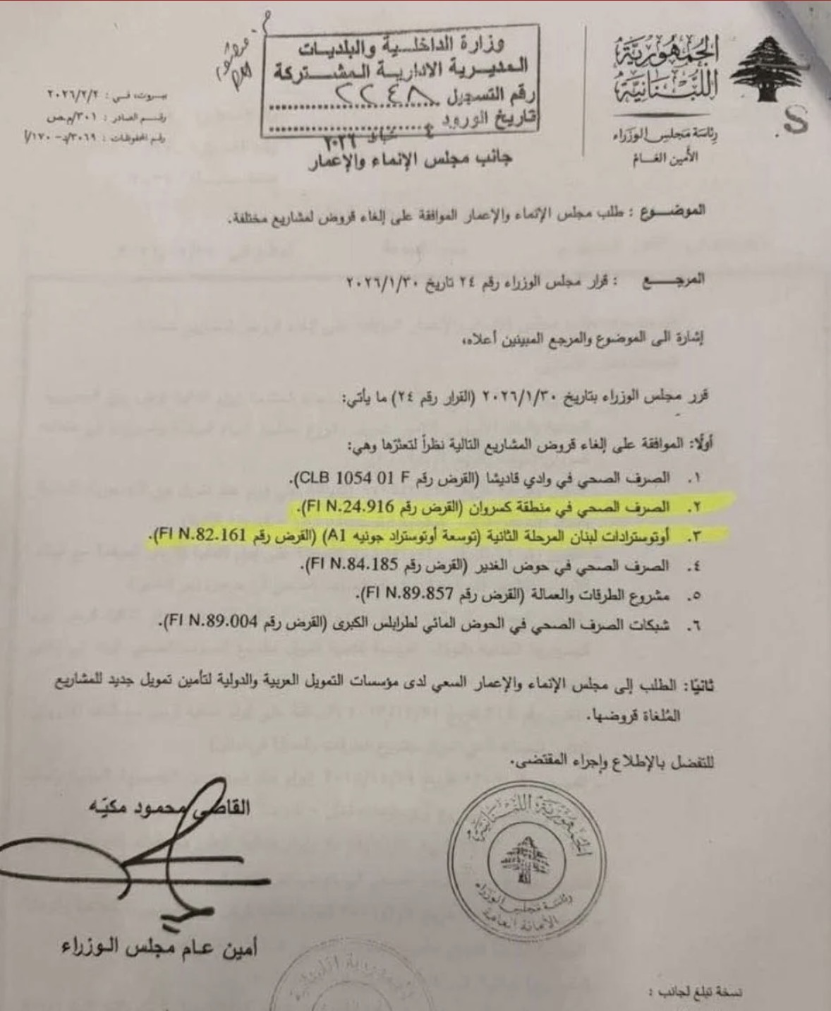 مشروع توسعة أوتوستراد جونيه A1 الذي كان يُعوّل عليه للتخفيف من «اختناق» السير على الأوتوستراد، بالإضافة إلى 5 مشاريع حيوية مثل الصرف الصحي في منطقة كسروان، كلها فرص فَوّتها لبنان عليه بسبب ضياع القروض والهبات التي كانت مرصودة لها بقيمة نحو 494 مليون يورو من مموّلين دوليين. مجلس الوزراء اتخذ في 30/1/2026 (أي قبل بدء حرب إسناد إيران)، قرارًا بالموافقة على طلب مجلس الإنماء والإعمار بإلغائها وليس تأجيلها. لماذا؟ من هي الجهة المموّلة لتلك القروض؟ وهل يمكن استخدام الأموال المرصودة لمشاريع ذات غايات أخرى؟